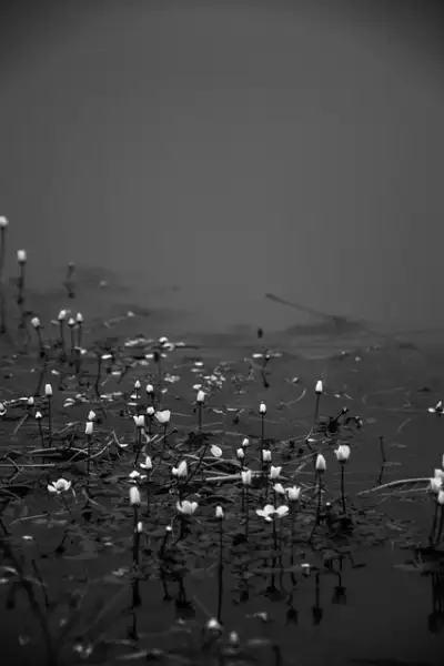 a street light sitting on top of a body of water under a foggy sky