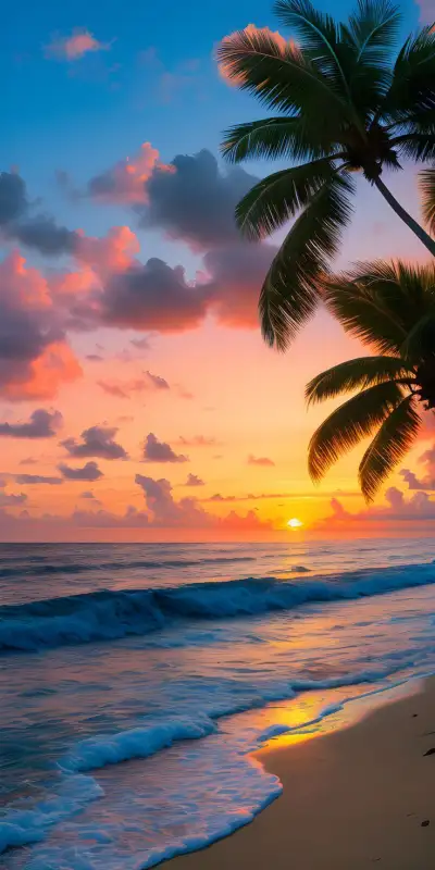 the sun is setting over the ocean with palm trees on the beach and waves coming in