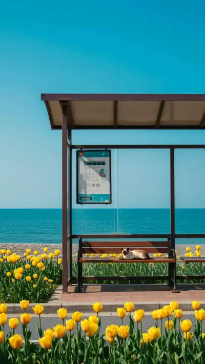 there is a bench with yellow flowers in front of the ocean