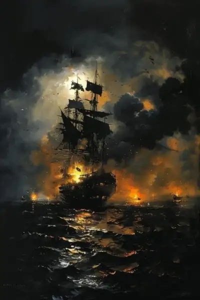 a painting of a ship in the ocean with fire coming out of it's sails