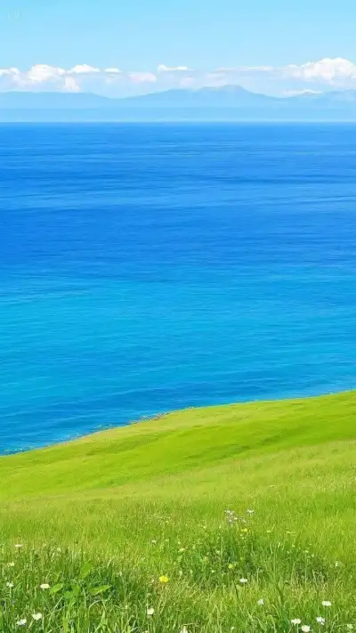 the ocean is blue with clouds and yellow flowers