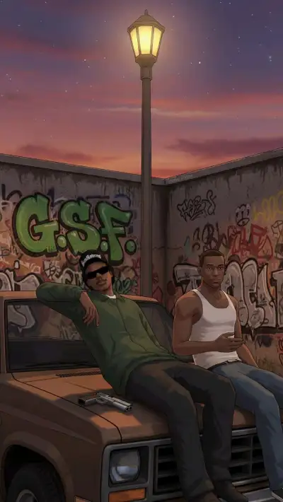 Wallpaper na work art mais famosa do GTA SAN Andreas do Cj no que seria a Orange Street Families