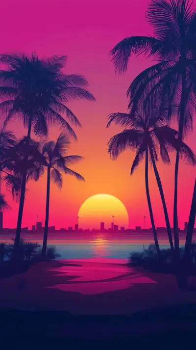 GTA Vice City inspired retro Miami lifestyle 1980s, sunset beach with a vintage car under palm trees