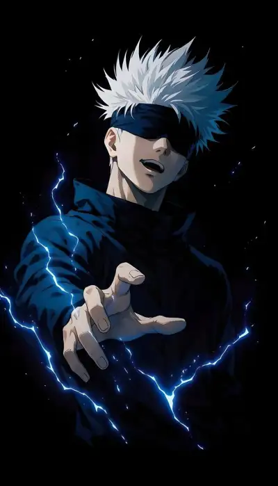 an anime character with white hair and blue eyes pointing to the side while lightning strikes behind him