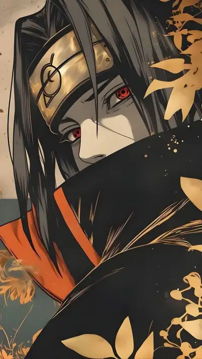 an anime character with black hair and red eyes