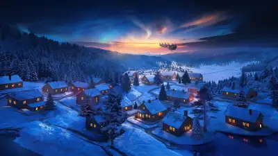 Santa Claus chariot, Christmas Eve, Winter snow, Village, Aurora Borealis, Reindeer Chariot, Forest, Sunset, 5K