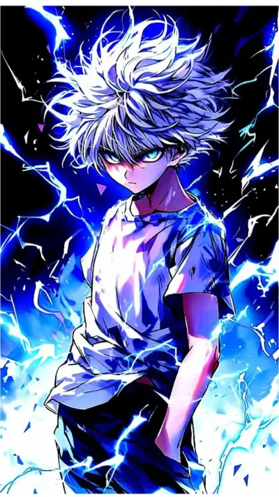 an anime character with white hair and blue eyes, standing in front of lightnings