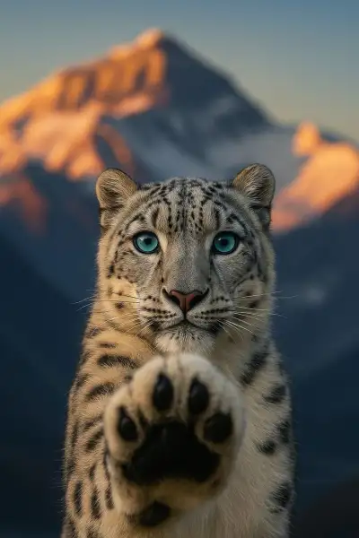 a snow leopard with blue eyes pointing at the camera while standing in front of a mountain