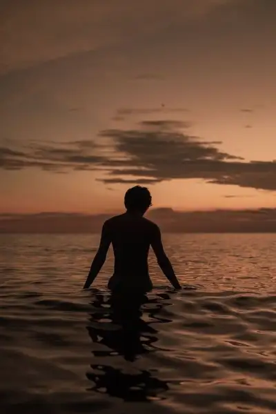 a man standing in the water at sunset