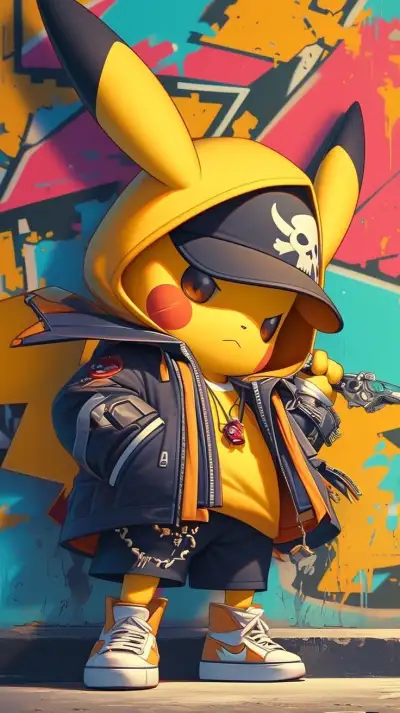 the pikachu character is standing in front of a graffiti wall with his hand on his hip