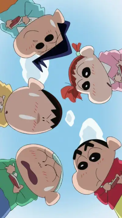 four cartoon characters are standing in a circle with their heads tilted to the side and looking up