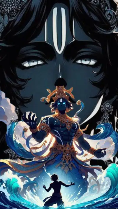 an anime character with long black hair and blue eyes, standing in front of the ocean