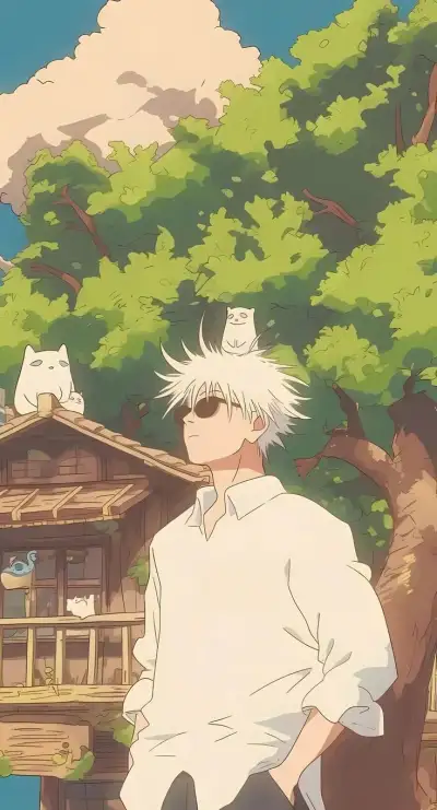 an anime character with white hair and sunglasses standing in front of the sky holding his hands together