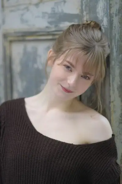 a young woman with blue eyes wearing a black and white sweater looking off into the distance