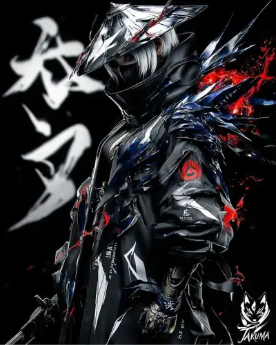 a drawing of a person wearing a black outfit and chain around their neck, standing in front of a red background