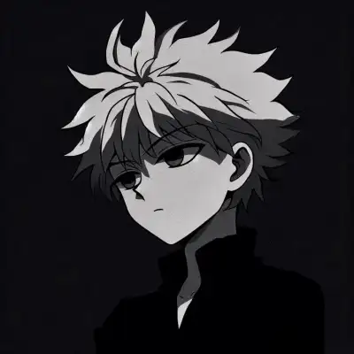 an anime character with white hair and black eyes, wearing a black shirt in front of a dark background