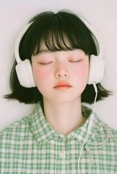 a young woman wearing headphones with her eyes closed