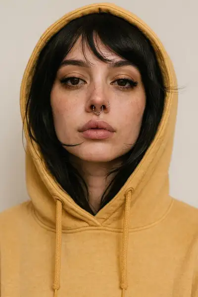 a woman with dark hair wearing a yellow hoodie and looking off to the side