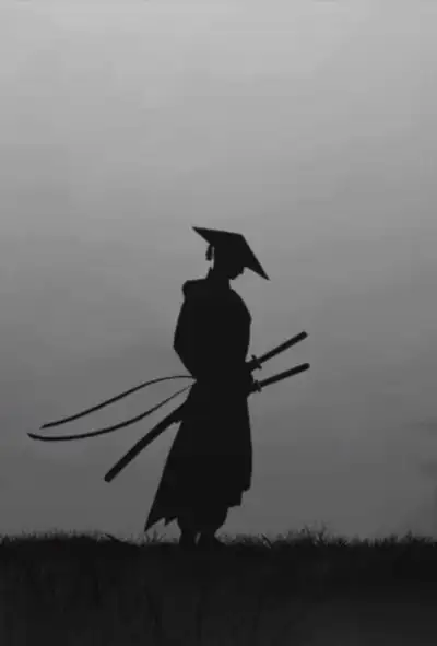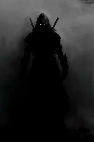 a man with two swords in his hand standing in the fog wearing a black outfit