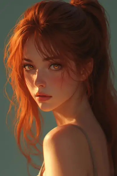 a woman with red hair and blue eyes is looking at the camera while wearing a tank top