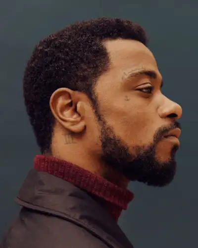 a close up of a person with a beard and wearing a sweater looking off to the side
