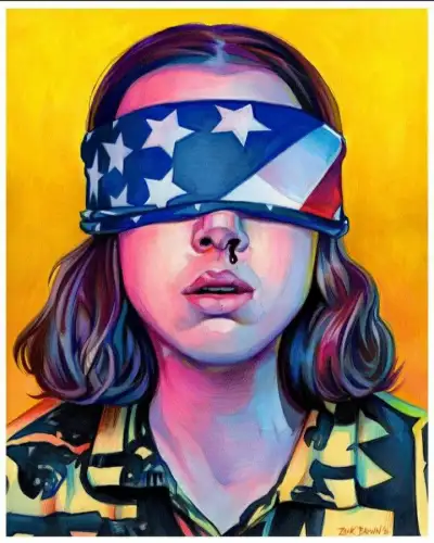 a painting of a girl wearing a blindfold with the american flag painted on her face