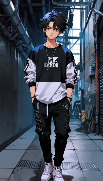 a young man with black hair standing in an alley way wearing a black and white shirt