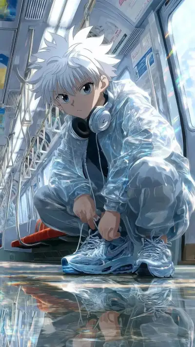 an anime character kneeling down on the ground with headphones in his ears and looking at something
