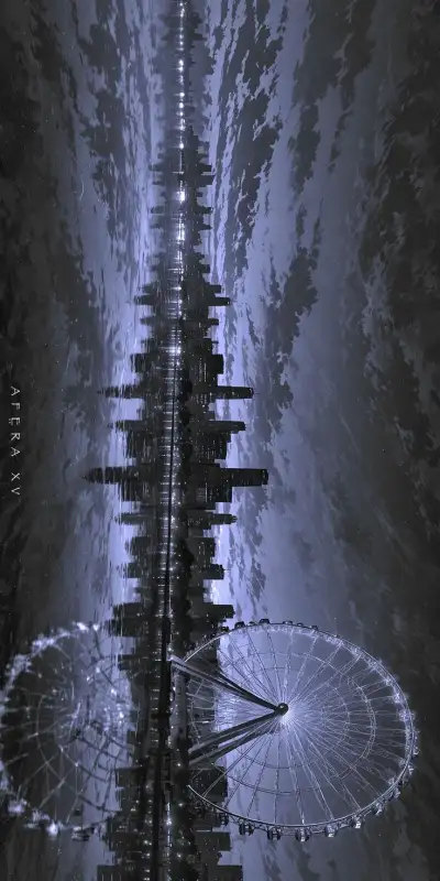 the city skyline is lit up at night with clouds in the sky and buildings on either side