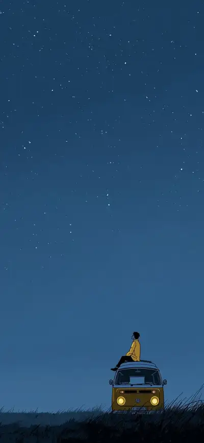 a person sitting on top of a car under the stars