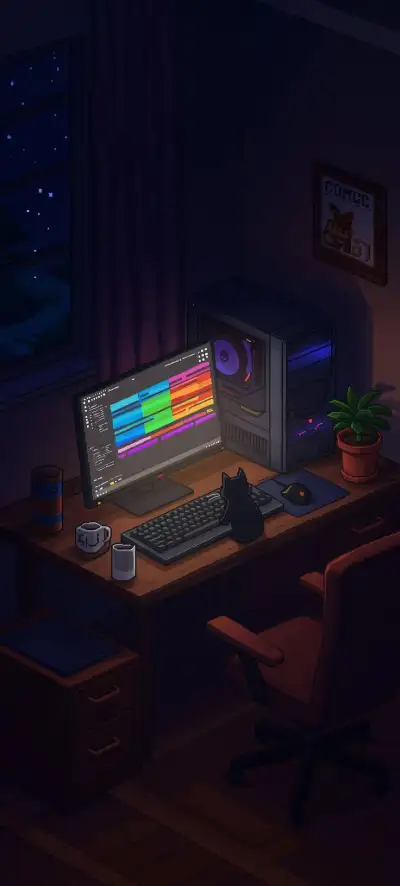 a computer desk with a cat sitting on top of it
