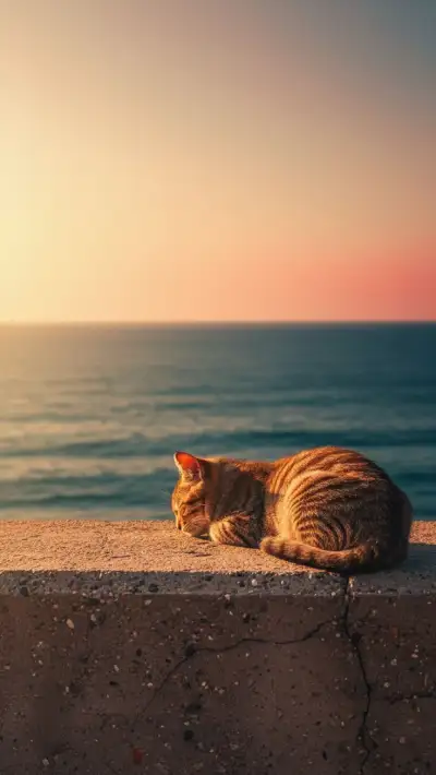 a cat sitting on the edge of a concrete wall next to the ocean at sunset