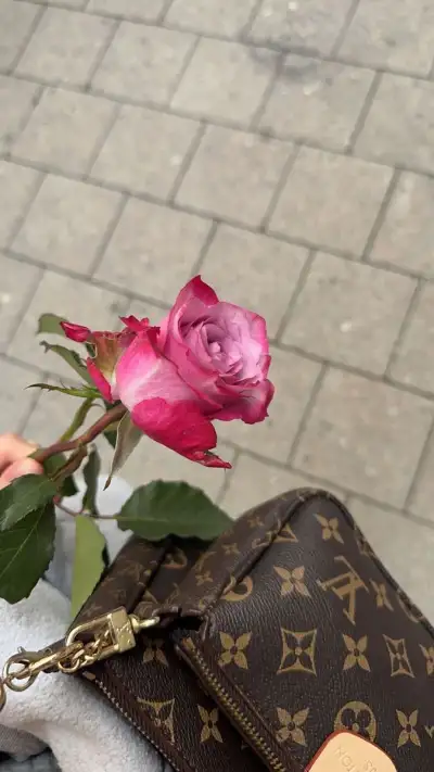 a pink rose sitting on top of a purse next to a person's hand