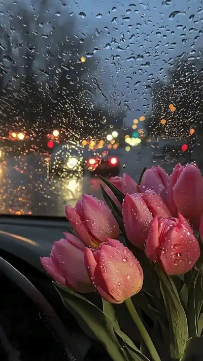 pink tulips sitting in the front seat of a car on a rainy day