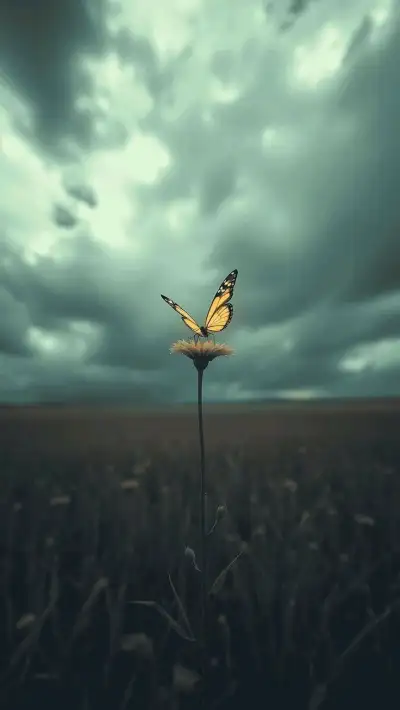 a yellow and black butterfly sitting on top of a flower in the middle of a field