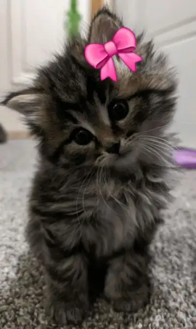 a small kitten with a pink bow on it's head sitting on the floor