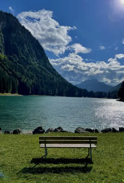 a park bench sitting next to a tree near the water with mountains in the background