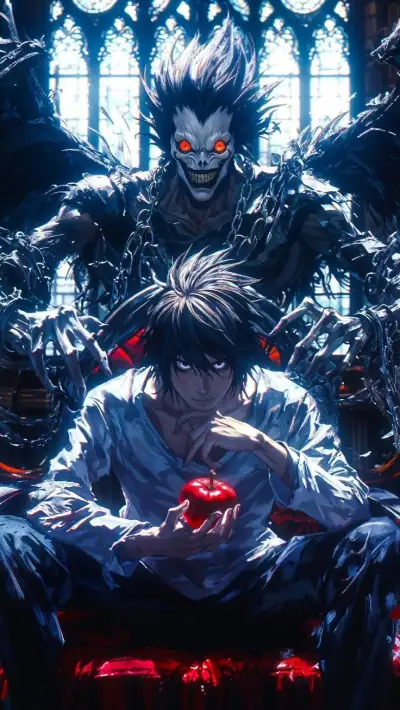 two anime characters sitting on a bench in front of a stained glass window, one holding an apple