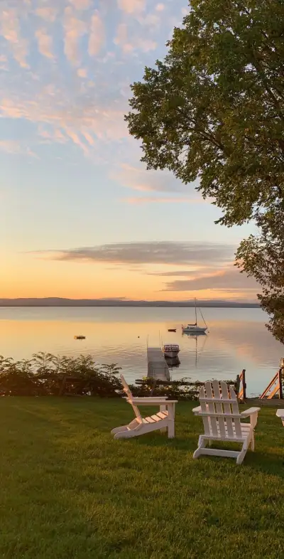 two white lawn chairs sitting on top of a lush green field next to a lake