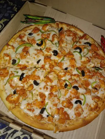 a large pizza in a box with toppings on the top and side pieces missing