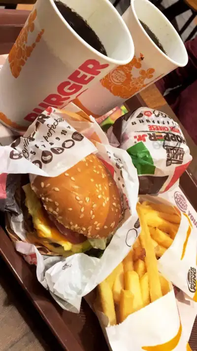 two cups of coffee sit on top of a tray filled with hamburgers and french fries