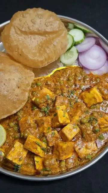 a metal plate topped with tofu and bread next to cucumber and onion slices