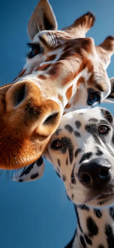 two giraffes standing next to each other with their heads close together and looking at the camera