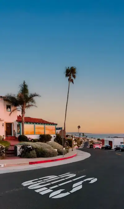 an aerial view of a pink car parked on the side of a road next to palm trees
