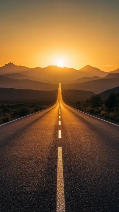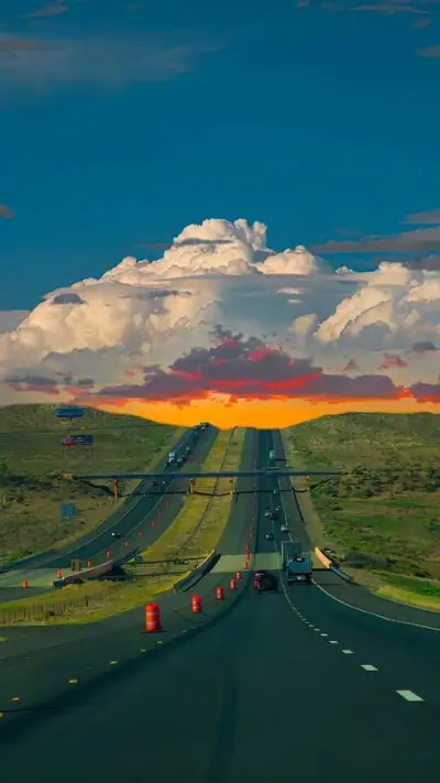 the sun is setting on an empty highway in the middle of nowhere, with cars driving down it