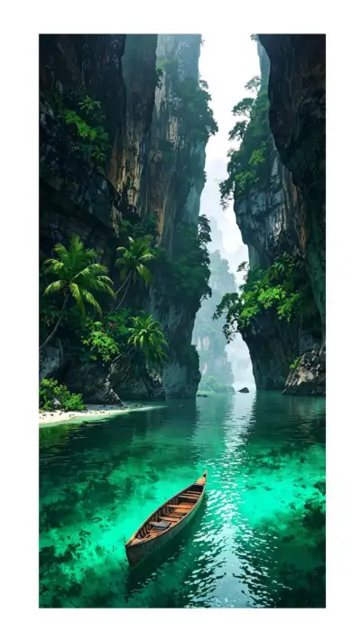 a boat floating in the middle of a river surrounded by mountains and greenery on both sides