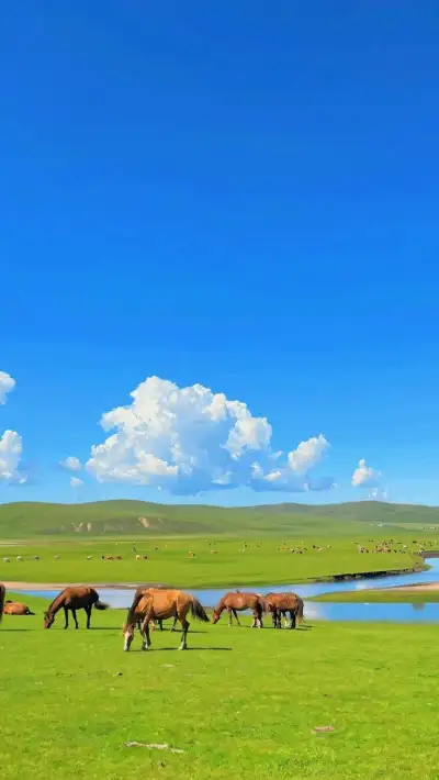 horses graze on grass near a body of water in the middle of a field