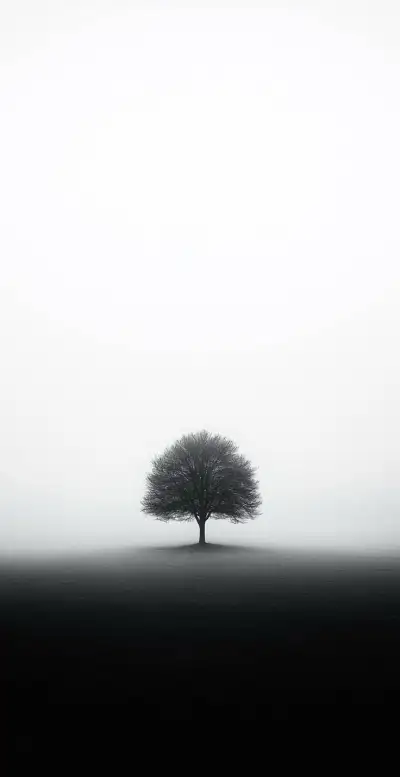 a lone tree stands in the middle of a field on a foggy, overcast day