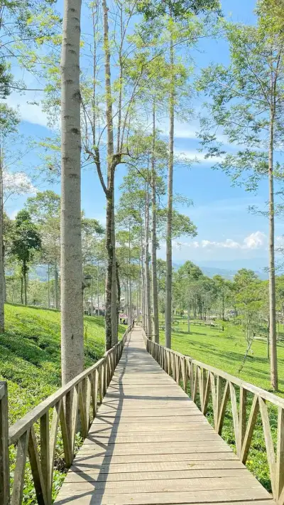 a wooden walkway in the middle of a green field with trees and grass on both sides