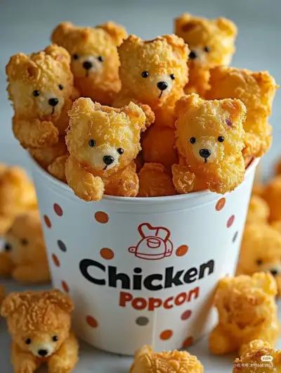 a bucket full of chicken popcorn with teddy bears on the side and in the middle